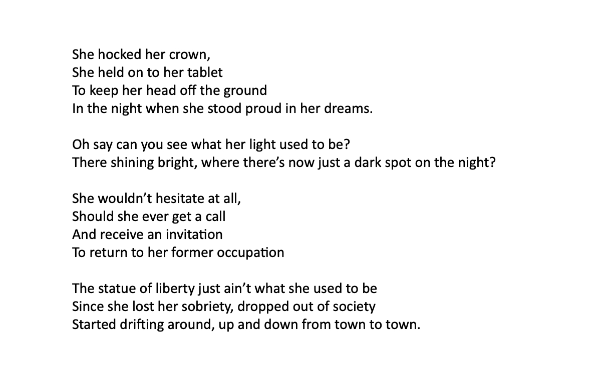 Keith has long been one of our hardest working song writers. He now returns to us, from Arlington, TX, with "Statue of Liberty". Keith was inspired by the Paul Simon lyrics, "I dreamed I was flying, and high up above my eyes could clearly see the Statue of Liberty sailing away to sea". He then thought of the statue ambling off into the sunset and came up with this one. An otherwies sad and distopian world is delivered to us with a light hearted, major key, ditty in the style of country swing as the Statue of Liberty looks for other job opportunities. Keith used a couple of cool chromatic chords and techniques. He converts the I chord (F#, in this case) into a V7/IV before moving to IV (which he then converts to a major minor 7th chord). At the end of the stanza, he lands on V. He then raises the 5th on the V chord, making it an augmented (+) V chord, giving it a "shruggy" feel, before returning to I.