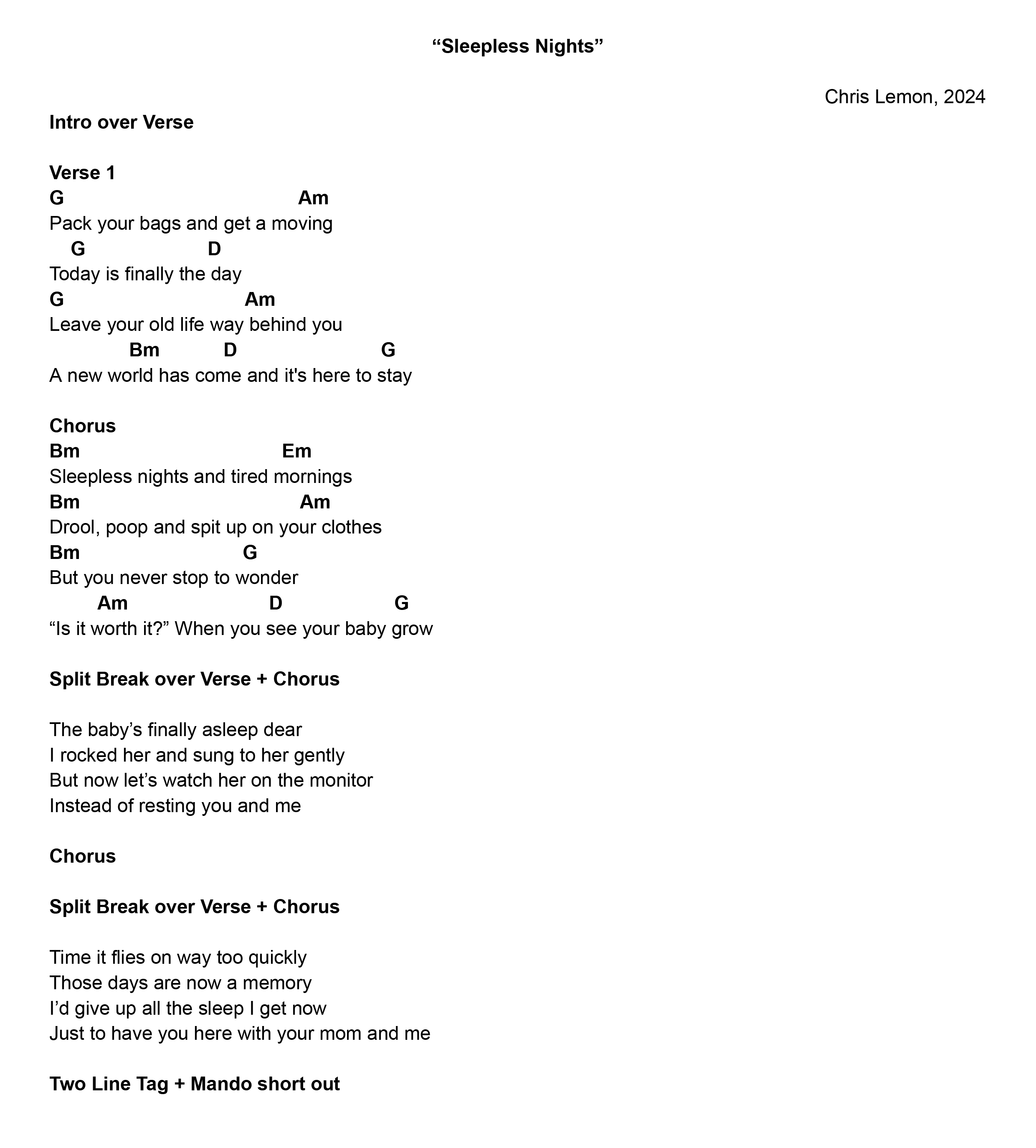 Chris and his wife recently welcomed their new adopted baby, Carissa, into their family. While their cups ran over with love and joy, they found themselves quite exhausted with their new routines and some of the messes that would accompany. While no stranger to the banjo, Chris hones his dobro skills and his recording chops on this one. He enjoys dabbling in chromaticism and uses slightly less traditional chord substitutions. For example you may see a ii chord where a IV may normally be or a iii chord in lieu of I or V. This adds a bit more depth and emotion to an otherwise rollicking bluegrass breakdown. Chris hopes that anyone who has experienced this stage of parenthood can relate to these bittersweet emotions!